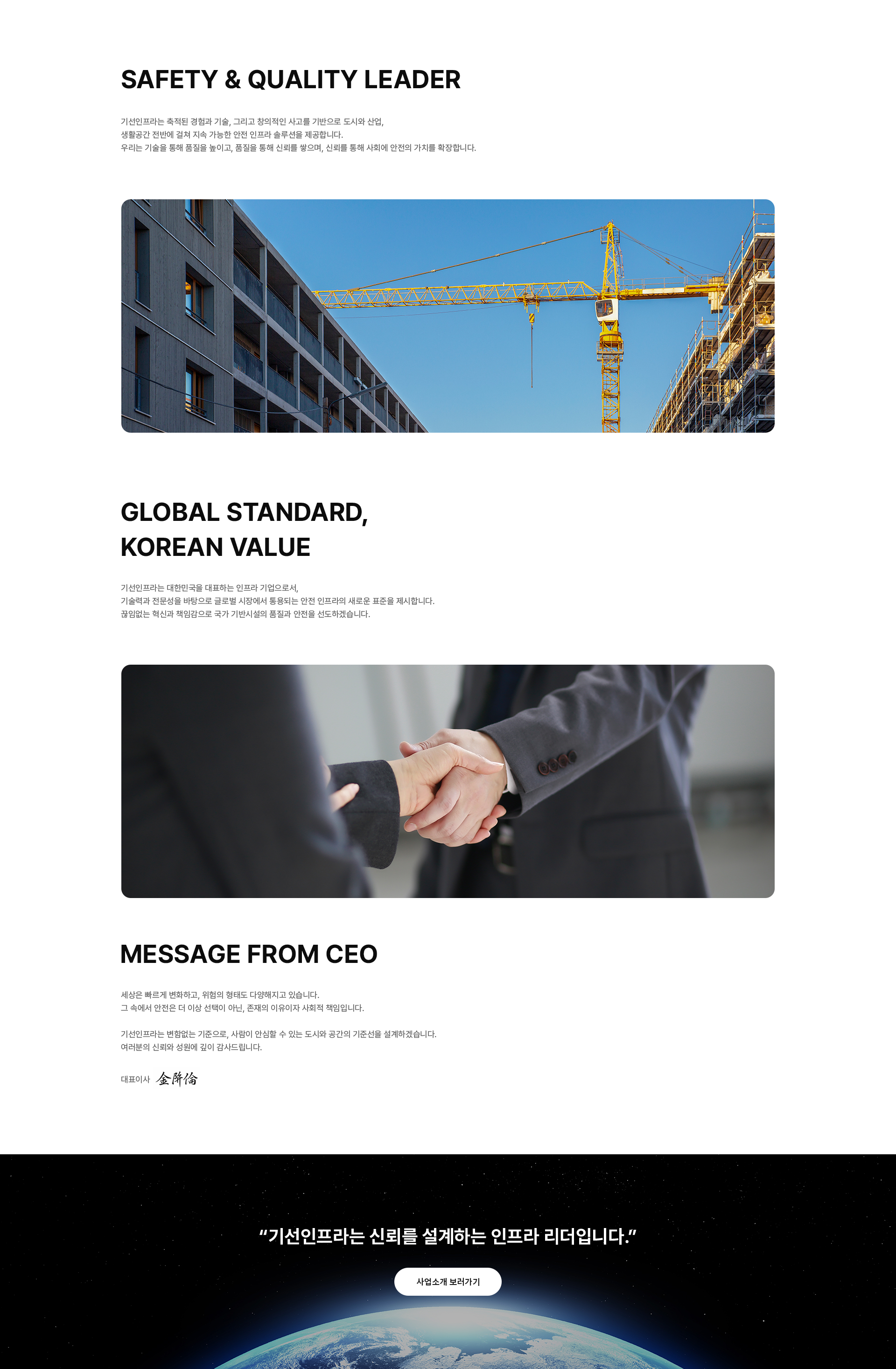 기선인프라는 ‘안전’과 ‘품질’을 기업의 근본 가치로 삼는 인프라 전문 기업입니다.